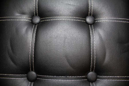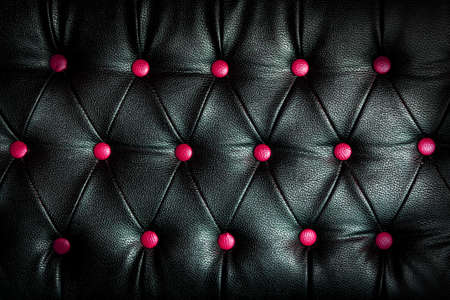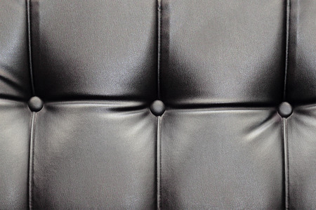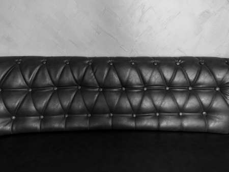 Leather sofa with pins and buttons background. Close up of vintage black long leather sofa seat on concrete wall background with copy space.