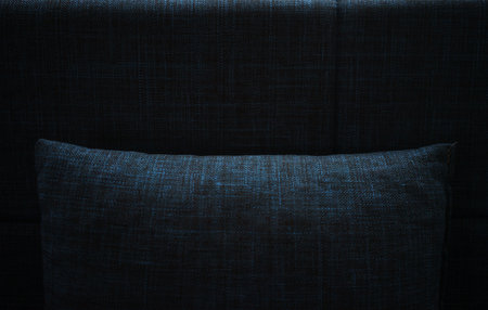 Blue tufted pillow on blue tufted couch, dark lighting, accent on material.