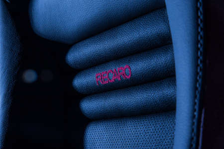 Modern Luxury car inside. Interior of prestige modern car in blue and pink tones. Comfortable leather seats. Perforarated leather. Modern car interior. Car inside