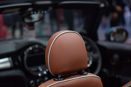 Brown leather interior of the luxury modern car. Perforated brown leather comfortable seats with stitching isolated on black background. Modern car interior details. Car detailing. Car inside