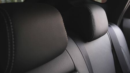 Close-up of a black leather seat of a modern car. The interior of a modern car with black leather seats.