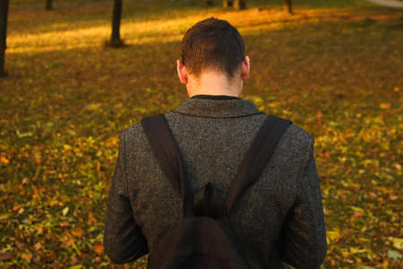 Defocus portrait of a young handsome man sad looking down in the park, the woods in autumn. Portrait on the nature of the park, the woods, on the street. Sad. Mental health. Out of focus.