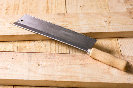 Handsaw wooden planks on wood board construction concept.