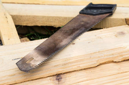 Rustic old hand saw on timber stack at construction site. Work tool for cutting in lumber industry