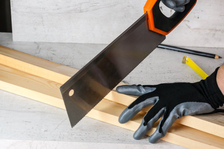 Carpenter sawing a wooden beam on the desktop