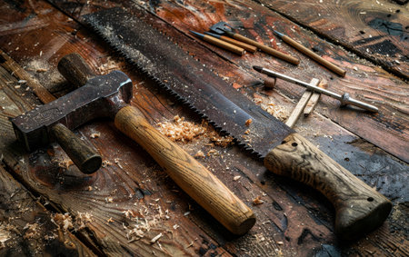 Close-up of old hammer, saw, and chisels on a rustic wooden table, illustrating traditional woodworking and craftsmanship