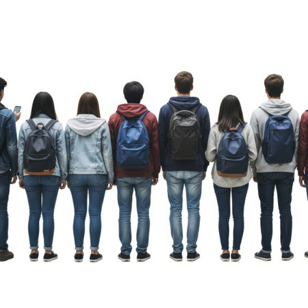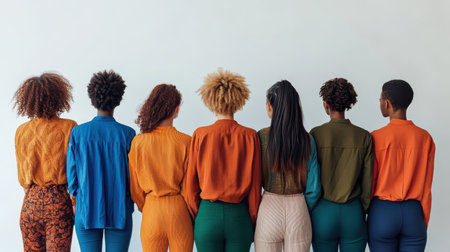 A group of eight people, with their backs turned, wear vibrant casual clothing, creating a striking visual of diversity and connection against a simple white backdrop.
