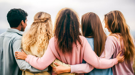 Generative AI : Diverse young friends hugging each other outdoors Multiethnic group of people standing together showing unity and teamwork Support and community concept