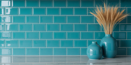 Blue vase with ears of wheat on a blue tile wall background