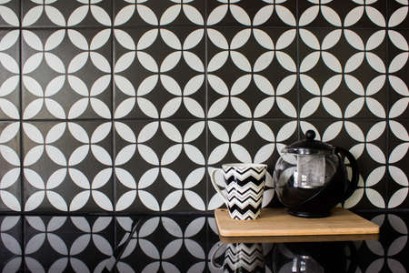 electric induction hob, ceramic mug and teapot on white worktop and tile on wall at contemporary kitchen