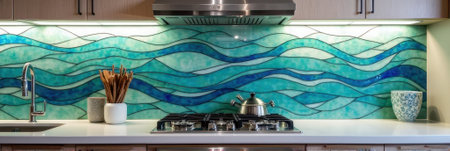 Modern kitchen with blue stained glass backsplash and stainless steel appliances. That the image is generated using AI.