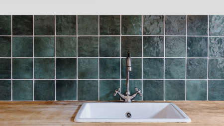 white sink and silver water faucet installed on wooden countertop surface and green tile on wall at kitchen in contemporary apartment