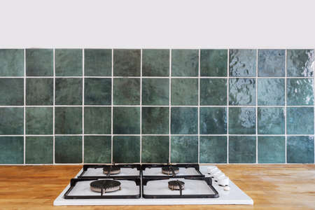built in white gas cooker with knob switch on control panel, wooden worktop and green tile on wall at modern kitchen, minimalist concept in interior of apartment
