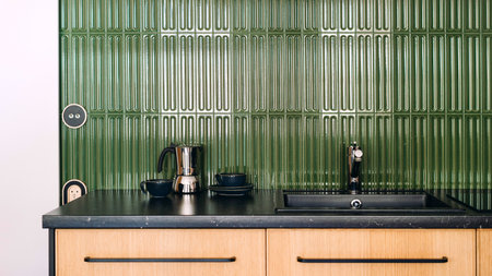 Contemporary and loft style kitchen showcases a green textured wall against wooden cabinetry, creating a stylish and functional space ideal for cooking and entertaining at home.