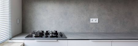 Stylish kitchen with gray countertop and gray wall behind simple kitchen hob
