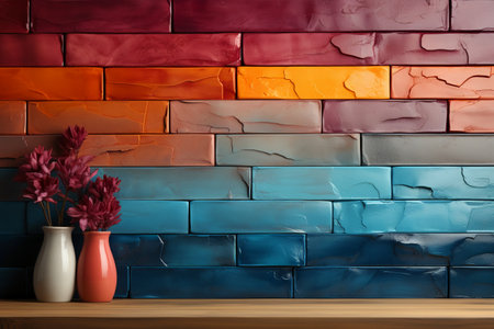 Vase with flowers on wooden table in front of colorful brick wall