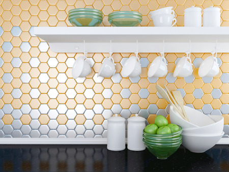 Kitchen utensils on the black worktop. Ceramic and glass kitchenware on the shelf in front of modern orange wall tile.