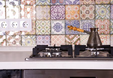 Cooking coffee on a gas stove. Old turkish copper pot for brewing coffee on stove in the kitchen. Early breakfast. Turkish method of brewing coffee.