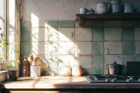 Charming rustic farmhouse kitchen with faded ceramic tiles and warm natural light aesthetic