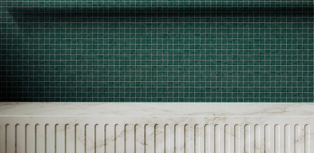 An empty marble countertop against a wall covered with deep bottle green ceramic tiles. Background for product presentations. Space for displaying cosmetics or kitchen products