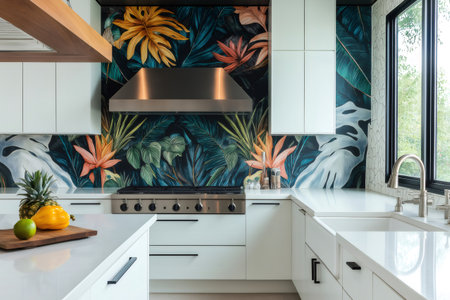 Tropical wallpaper adds a vibrant touch to this modern white kitchen, complete with stainless steel appliances and sleek countertops