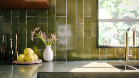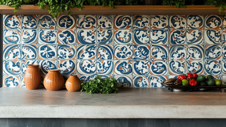 This serene kitchen scene features a beautifully designed countertop adorned with a colorful tile backsplash and fresh vegetables, creating an inviting cooking environment.