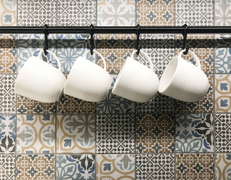 White ceramic cups hanging on hook in front of art pattern tile wall, in coffee shop or kitchenware store