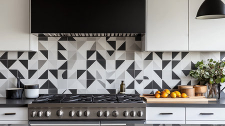 This contemporary kitchen showcases a striking geometric backsplash in monochrome hues, complementing sleek cabinetry and a professional-grade stove. Fresh fruit adds a lively touch.