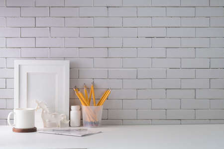 Comfortable workplace with blank picture frame, coffee cup, book and stationery on white table against brick wall. Copy space for your text.