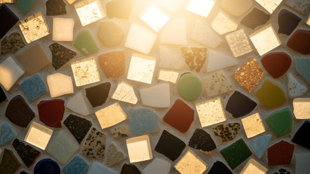 Close-up view of a vibrant mosaic wall, featuring a diverse array of colorful, irregularly shaped tiles reflecting warm, golden sunlight, creating a dazzling and inviting texture.