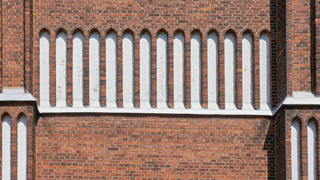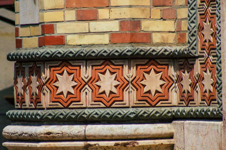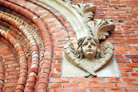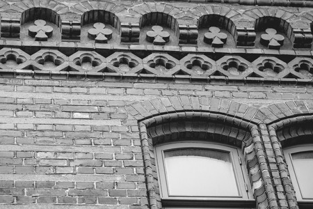 Old red brick house with ornaments. The walls have small cracks and chips. Patterns rounded.