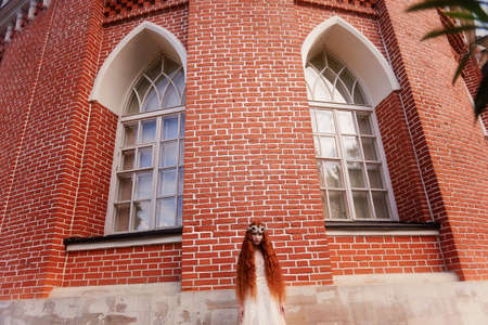 Beautiful red-haired girl with long curly hair in the bride, in a long lace dress. A natural beauty.