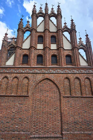 Windows on the red brick wall of the Catholic Church of St. Anne in Vilnius in autumn
