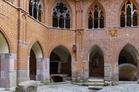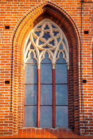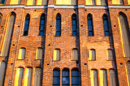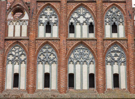 Architectural elements, vaults and windows of gothic cathedral. Red Brick walls. Kaliningrad, Russia. Immanuel Kant island.