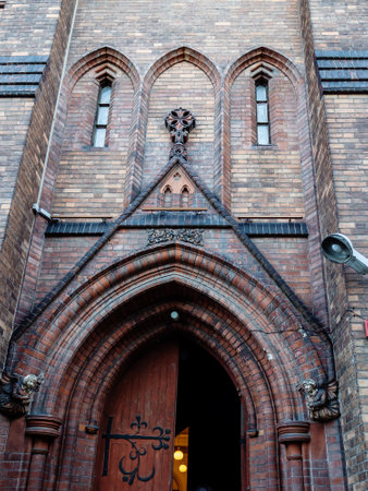 entrance to St Andrew's Anglican Church in summer twilight. The church is the sole Anglican church in Moscow city, Russia