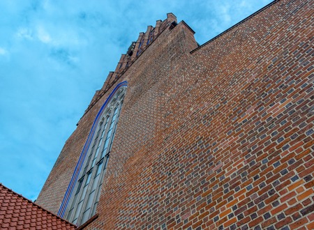 The high, narrow window of the church. The red brick masonry of the church