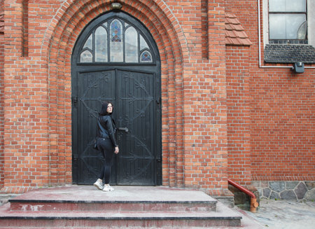 young beautiful brunette girl in black jacket and jeans stands near door of gothic church on summer day