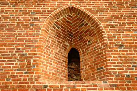 Entrance arch to Catholic Church of Gothic style of red brick. Brick arches in the Catholic cathedral st. Anne in Vilnius, Lithuania.