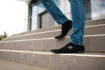 Close-up of male legs on stairs outside. Businessman walking down on a blurred stairs background. Career growth concept.
