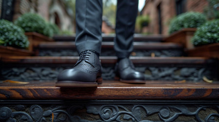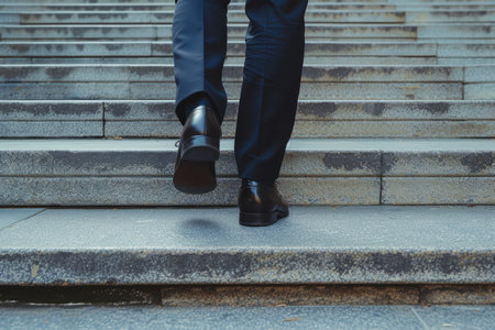 View of a business professional taking steps upward in smart black Oxford shoes, embodied ambition on a stone staircase.