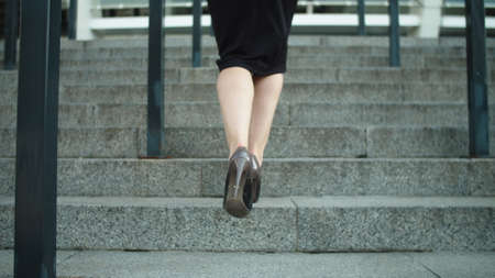 Close up unrecognized woman legs going upstairs at street. Female feet walking in high heel shoes outdoors. Sexy woman entrepreneur walking in stylish dress outside.