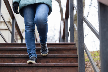 Female in jeans and sneakers going up steep stairs