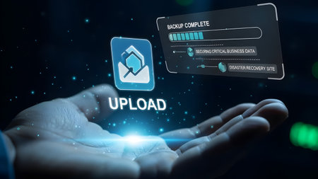 Hand holding a glowing UPLOAD icon with a backup progress bar and data security details.
