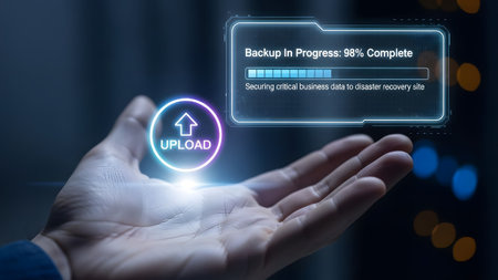 Hand holding glowing upload icon and backup progress bar interface Clear details and vibrant colo...