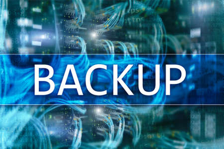 Backup button on modern server room background. Data loss prevention. System recovery.