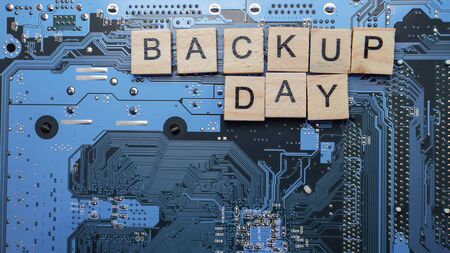 backup. Wooden letters on the office desk, informative and communication background.