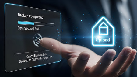 Hand with glowing upload icon and data secured progress bar. Clear details and vibrant colors enh...