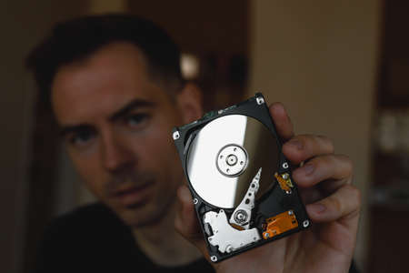 A man holding an HDD disk in his hand