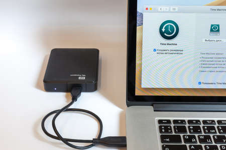 Moscow / Russia - July 7, 2019: Open MacBook, on-screen program Time Machine. An external hard drive is connected to the MacBook.