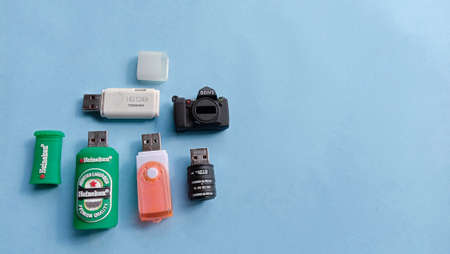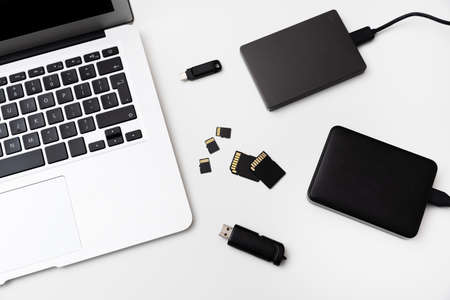 USA - 2021: Various digital data storage devices. Usb sticks, external hard drive, SD cards, mini and micro SD cards, laptop on white isolated background. Flat lay copy space text